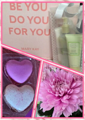 Först fikar vi och umgås. Sedan får vi möjlighet att prova Mary Kay och deras spa-set.
